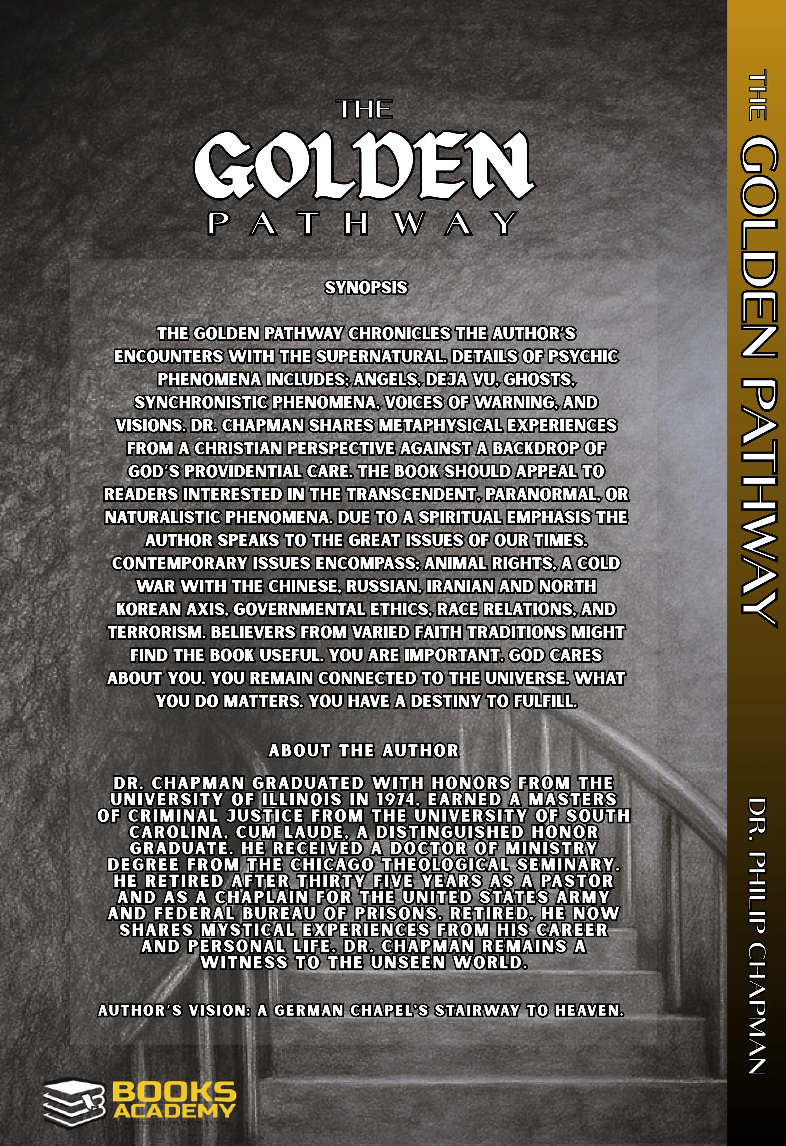 THE GOLDEN PATHWAY chronicles the author’s encounters with the supernatural. Details of psychic phenomena includes; angels, deja vu, ghosts, synchronistic phenomena, voices of warning, and visions. Dr. Chapman shares metaphysical experiences from a Christian perspective against a backdrop of God’s providential care. The book should appeal to readers interested in the transcendent, paranormal, or naturalistic phenomena. Due to a spiritual emphasis the author speaks to the great issues of our times. Contemporary issues encompass; animal rights, a cold war with the Chinese, Russian, Iranian and North Korean Axis, governmental ethics, race relations, and terrorism. Believers from varied faith traditions might find the book useful. You are important. God cares about you. You remain connected to the universe. What you do matters. You have a destiny to fulfill.